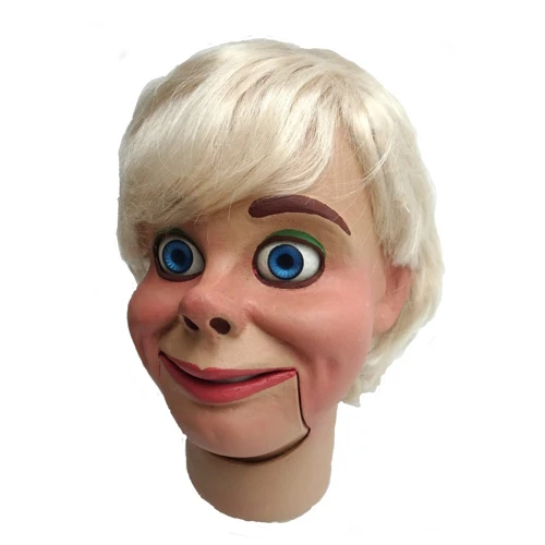 Deze pop is prachtig. Gemaakt door Jerry Lane, een oude buikspreker uit Amerika. Het hoofd kan bewegen, de ogen kunnen alle kanten opkijken en natuurlijk gaat de mond/kin zeer goed van elkaar. Dit alles is bedienbaar vanuit de rug. Het hoofd is gemaakt van zeer sterk kunststof, maar ziet eruit als een echt houten hoofd van vroeger. Uitgerust met een leuk half lang blond pruikje, is deze pop het neusje van de zalm. Hij heeft nu een grijze broek en blauwe trui aan. De gebruikte kleding is zeer eenvoudig en eigenlijk is het de bedoeling dat je de pop aankleedt met iets dat bij jou past. Het frame van het lichaam kan heel makkelijk met iets moois aangekleed worden. De hoogte is ongeveer 105 cm. De pop heeft geen schoenen aan.