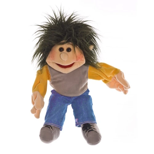 Tobi is een leuk mannetje. Deze grapjas heeft een leuk rommelig kapsel in een donkere bijna zwarte kleur. Ook heeft ie een mooie rugzak en zijn broek kan echt uit. Gewoon een mooi ventje met grappige kleding die makkelijk vanuit de nek te bespelen is en ook zijn handen doen mee. Natuurlijk weer zo’n mooie pop van Living Puppets. Niet voor super grote handen!