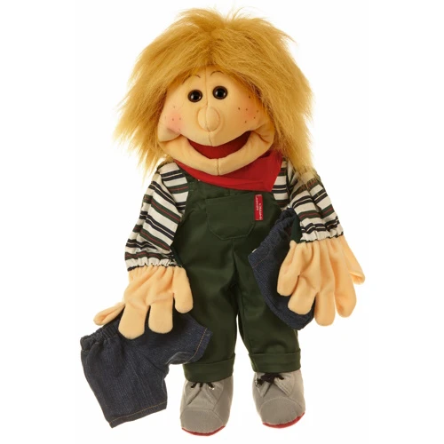 Stevig ventje onze Pelle. Hij heeft standaard een leuke tuinbroek aan, maar op zijn rug draagt hij een tas mee, waarin zijn korte spijkerbroek verstopt zit. Je kan Pelle dus verkleden voor mooi weer. Lekker hoor zo nu en dan met je blote beentjes in de lucht. Van Living Puppets