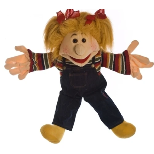 Maja is 65cm groot en is van het merk Living Puppets. Zij is geheel van stof en heeft een tuinbroek van jeansstof met zakje aan de voorkant. Ze heeft 2 staartjes in het haar met een rood strikje. Ze draagt een gebreide trui met leuke strepen. De pop en kleding kun je wassen op 30 graden. De broek van Maja kan uit en dus vervangen worden voor een andere outfit. De ingang naar haar mond zit in haar achterhoofd. Extra leuk aan deze pop is dat je jouw handen in haar armen en handen kan steken, waardoor je haar hand en vingers kunt bewegen.