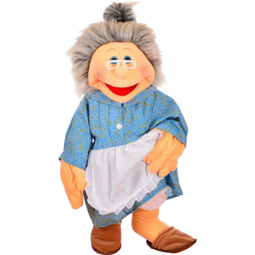Oma is 65cm groot en is van het merk Living Puppets. Zij is geheel van stof en heeft een soort gebloemde jurk aan met een mooie ouderwets schort voor. Zij heeft grijs haar met een daarop een leuke knot. Oma draagt ook een bril. De pop en kleding kun je wassen op 30 graden. De kleding van oma kan uit en dus vervangen worden voor een andere outfit. De ingang naar haar mond zit in haar achterhoofd. Extra leuk aan deze pop is dat je jouw handen in haar armen en handen kan steken, waardoor je haar hand en vingers kunt bewegen.