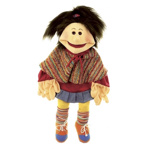 Deze vrolijke shopaholic is 65 cm groot en is van het merk Living Puppets. Zij struint de grote wereld steden af om de mooiste en hipste kleding te scoren. Zij is geheel van stof en heeft een rode jurk, gestreepte poncho en prachtige beenwarmers aan. Een trendy tas maakt het af. De pop en kleding kun je wassen op 30 graden. De poncho en beenwarmers kun je vervangen. Om haar mond te bewegen steek je je hand in haar achterhoofd. Leuk aan deze pop is dat je jouw hand in haar arm en hand kan steken, waardoor je haar hand en vingers kunt bewegen.