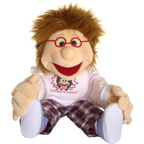 Weer zo’n leuke gast van Living Puppets. Petertje is wel een betwetertje. Je kan het al zien aan zijn brutale bril en looks. Handen zijn bedienbaar en mond en tong. Hij draagt stoere gympen en heeft een geruite broek aan. Zijn haardos is roodachtig en lekker pluizig.