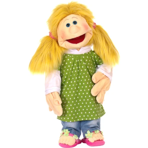 Philien is 65 cm. lang, heeft rijkelijk lang blond haar, waar zelfs 4 staarten in ziten. Ze draagt een beetje verbleekte jeansbroek met aan haar voeten leuke slippers. Boven draagt ze een T shirt met lange mouwen en een capuchon met daarover heen een groen jurk met witte sterretjes. Top wijffie, dat zeker mag worden gezien. Gemaakt door Living Puppets.