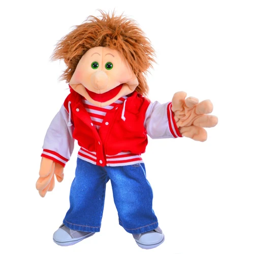 Dit is Stuart. Vlotte gast met rood haar en inderdaad kent geen smart. Altijd maar weer stoer doen. Draagt een spijkerbroek met lijke grijze gympen. T. shirt in wit/rood gestreept en daaroverheen een stoer jackie, rood met witte mouwtjes. Makkelijk bespeelbaar, vanuit de nek de tong en mond en ook de beide handen kunnen goed mee. Alle kleding en de gympen kunnen ook uit. Living Puppets.