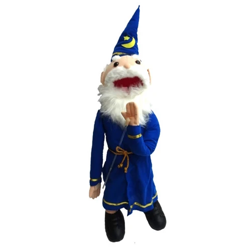 De lengte van deze pop is 70cm zonder zijn muts. Onderaan z’n rug zit de ingang naar zijn mond. Hij draagt en blauwe tovenaarsjurk en muts. De kleding kan niet uit. Met een doorzichtig plastic stokje kun je ook zijn handen bewegen, maar deze hoef je niet te gebruiken. Het stokje kan met klittenband aan zijn handen worden bevestigd. Goedkope en zeer leuke pop.