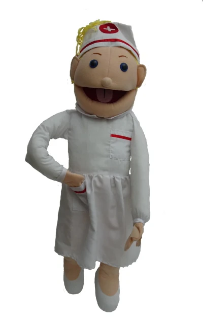 Deze buikspreekpop is ongeveer 70 cm groot. Ruime mond die vanuit de rug makkelijk te bedienen is. Helemaal gemaakt van zachte stof. Aan één van de handen zit een transparante stok, zodat ook die hand beweegbaar is. Mooie namaakschoentjes! Ideaal om kinderen met een ziekenhuis sfeer te laten kennis maken.