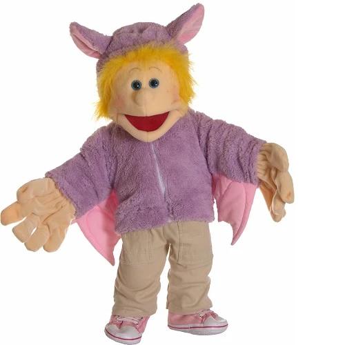 Soms wil je je eigen pop even wat anders aankleden. Misschien moet jouw pop naar een feestje of wil hij of zij misschien eens een ander voorkomen hebben? Wie zal het zeggen. Living Puppets heeft 3 hele mooie kostuums gemaakt voor alle grote handpoppen van 65 cm. Er is een heel leuk roze vleermuisjas, compleet met vleugels en muts met vleermuis oren. Ook is er een leuk koks kostuum met koksmuts en zeker heel goed te gebruiken om kinderen die misschien bang voor de dokter zijn gerust te stellen met jouw pop: een echt dokters kostuum. Dit is de vleermuisjas.
